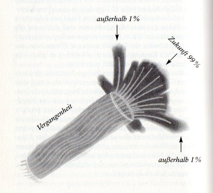 Unsere Zeitlinien erstrecken sich also auch in die Zukunft. Dort fächern sie sich in tausend leuchtende Fäden auf, von denen jeder einzelne für eine mögliche künftige Entwicklung steht. Man kann